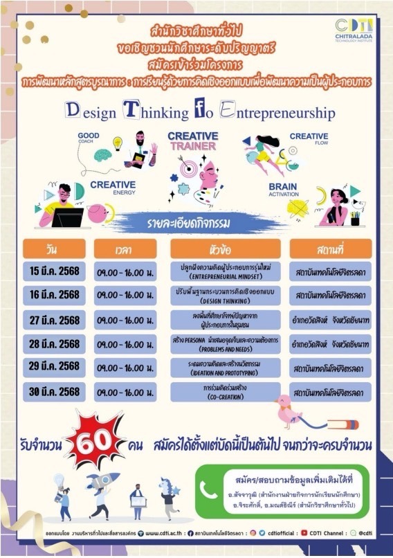 ขอเชิญชวนนักศึกษาระดับปริญญาตรี สมัครเข้าร่วมโครงการการการพัฒนาหลักสูตรบูรณาการ การเรียนรู้ด้วยการคิดเชิงออกแบบเพื่อพัฒนาเป็นผู้ประกอบการ