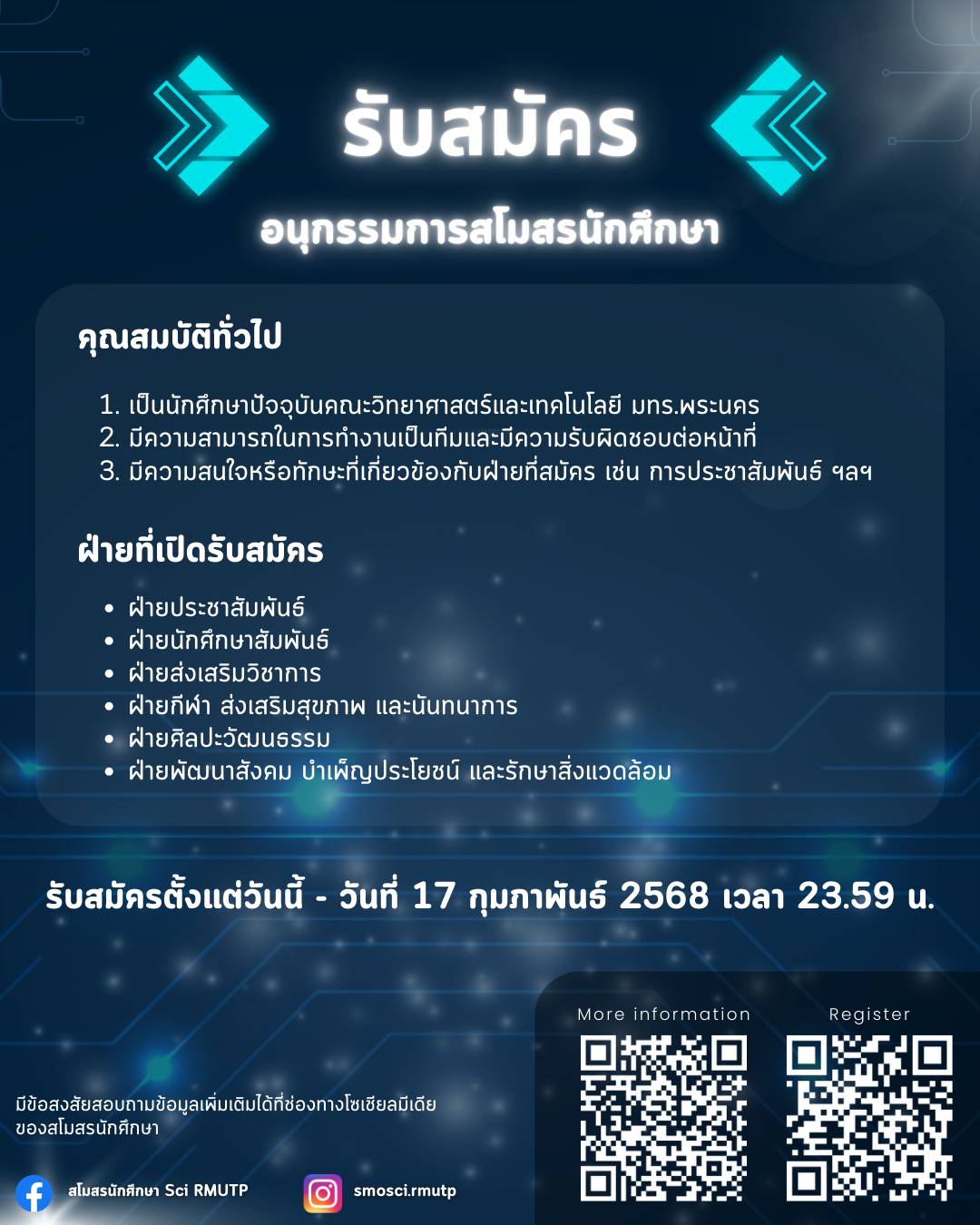 โดยคุณสมบัติผู้สมัคร และหน้าที่ของฝ่ายที่สนใจสมัคร สามารถอ่านเพิ่มเติมได้ที่ : https://bit.ly/smosci-rmutp-subcommittee